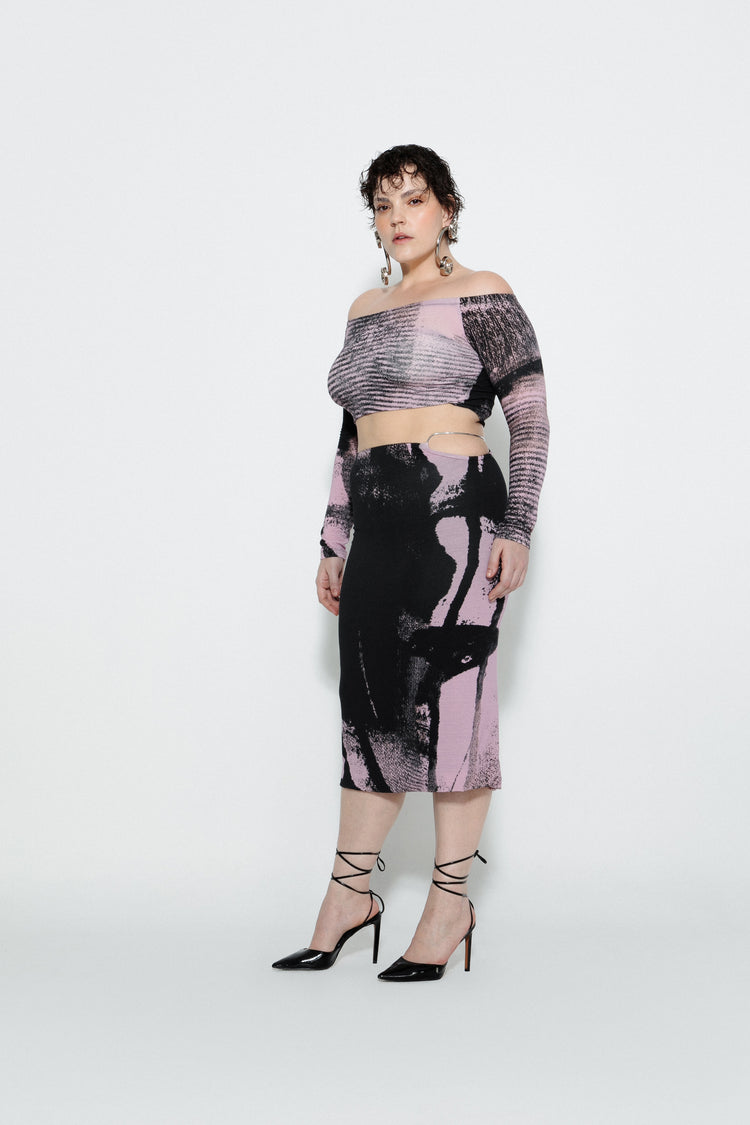 A Saia Midi Estampada Blur valoriza a curva do quadril com um recorte estratégico e aro metálico KV lateral, revelando a pele de forma delicada. O posicionamento da estampa Blur, aplicada digitalmente sobre o tecido, varia a cada peça, fazendo com que cada saia se torne única. Use com a Blusa Ombro a Ombro para um look completo.